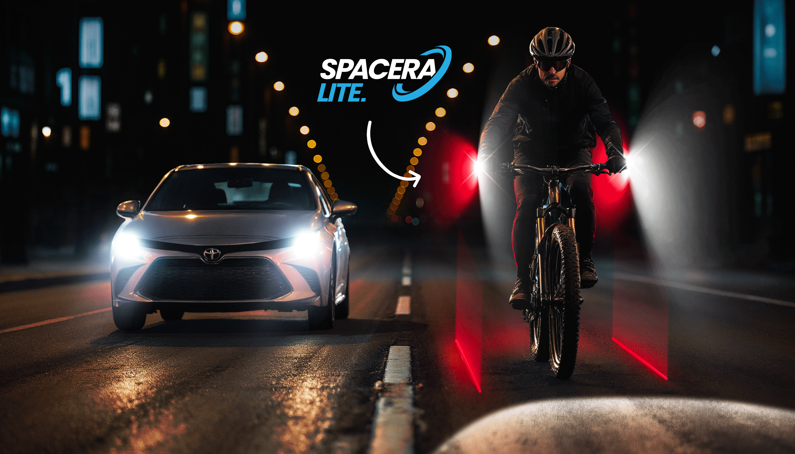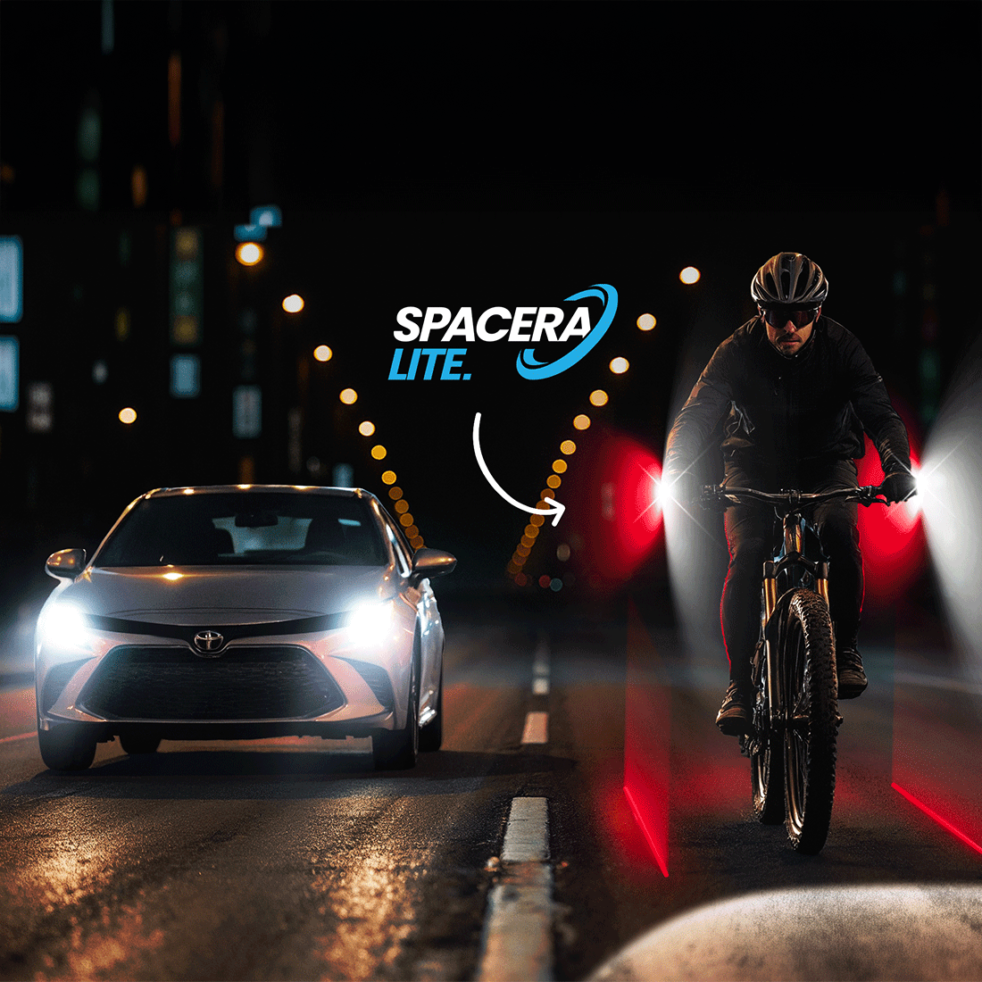 Spacera Lite is a 3-in-1 Bikelight Laser System integrating two front lights, two rear lights, and a ground laser into your handlebar ends. It provides 360° visibility in a sleek design that boosts both safety and style.